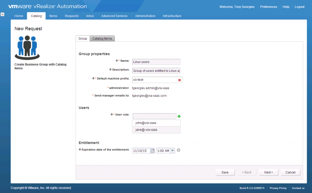 After assigning to the proper entitlement, we can start requesting the catalog item. You can see how the administrator and catalog fields have been already populated, making it easier for us to fill in the other details.