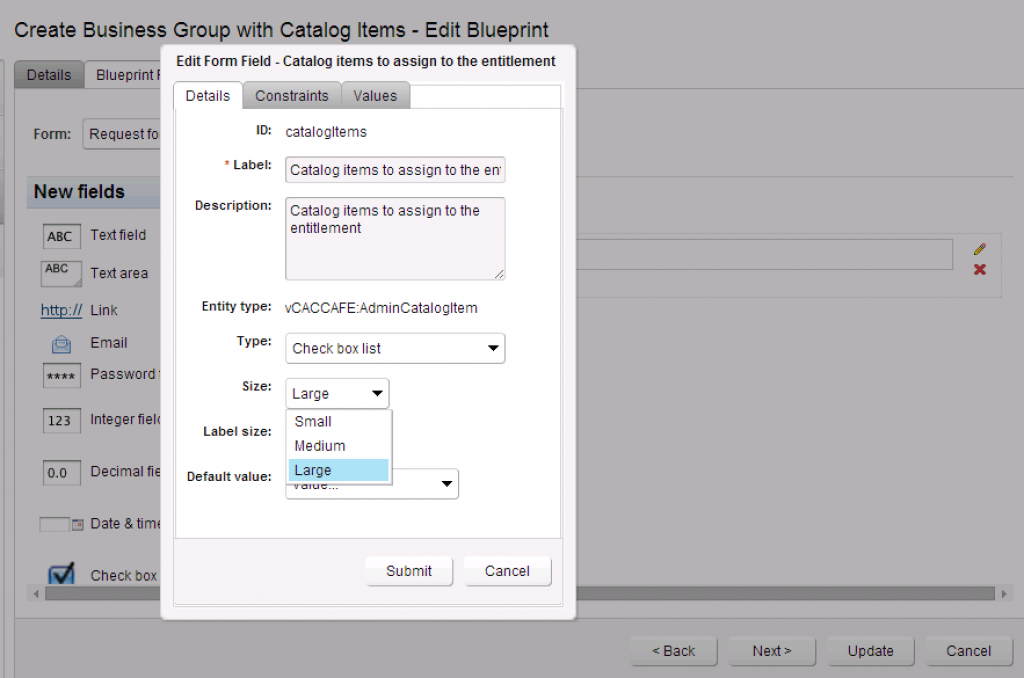 It basically calls vCAC’s Catalog API to retrieve the Catalog items that are not associated with a specific business group and orders them by name. It returns only the first 100 items, you may want to increase it. But have in mind that 100 items are a lot, so you may consider using an alternative approach to pick catalog items, like using a search component or tree.
