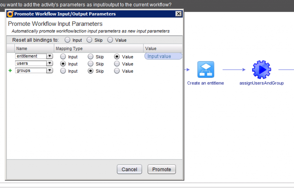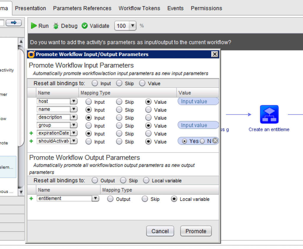 Next if we follow the steps from the UI scenario, we have to create an entitlement. We drop another workflow element and select the “Create an entitlement”. We open the bindings editor again.