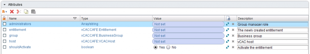 The attributes administrators, group and entitlement will be populated in the execution of the workflow. The shouldActivate is marked as true, as we want the entitlement to be active. For the host we will select a VCACHost from vRO’s inventory. Make sure you have added hosts using one of the “Add a vCAC host” workflows.