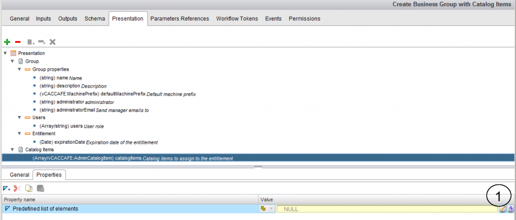 Now we will tweak it a bit, adding the cherry on the cake. We can take some time to style the presentation of the workflow. All inputs fields can be grouped in steps and groups, and have specific constraints. One important thing here to do is to define predefined list of elements for the catalogItems so that only shared catalog items for the current tenant are shown. For this purpose we will create a scripting action called “listAdminCatalogItems“. The action will take a vCACHost as input and return an Array/AdminCatalogItem. The code for the action