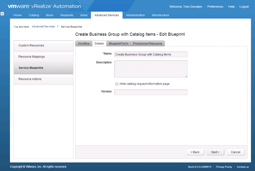 Give some details about the blueprint (Hint: you can check the “Hide catalog request information page” so that the Request information tab in the catalog request is removed)