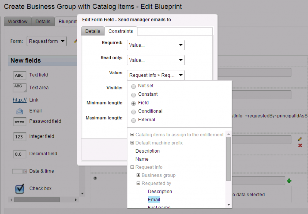 When the field editor opens up, we open up the constraints tab and define a fixed value constraint pointing to the request info properties and more specifically the requestor’s principalID