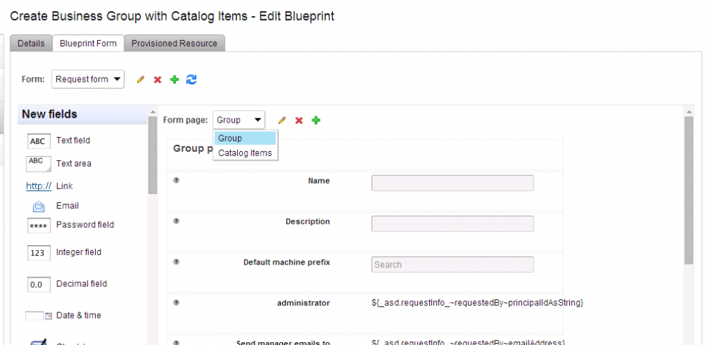 Next we can can tweak the ASD form by binding the request details. So instead of the user having to type every time his/her username and password, we can bind it to the one requesting the blueprint. We will do that by hovering over the administrator field and clicking on the edit button